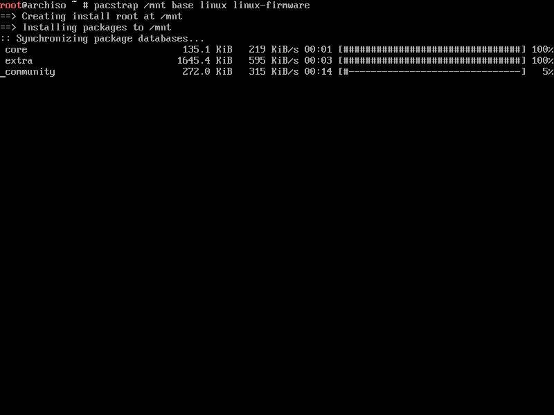 Nous vous recommandons également d’exécuter la commande «pacstrap / mnt nano» pour installer l’éditeur de texte, car il n’est pas inclus dans les dépôts de base et nous en aurons besoin plus tard. Et si nous voulons plus de programmes de base, nous pouvons également ajouter «base-devel» à la liste de commandes pacstrap ci-dessus.