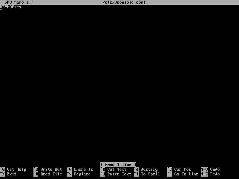 Avant de terminer avec tout ce qui concerne le système, la seule chose à faire est de définir la disposition du clavier espagnol sur la distribution. Pour ce faire, nous éditons le fichier «/etc/vconsole.conf» pour ajouter «KEYMAP = es»: