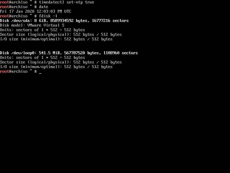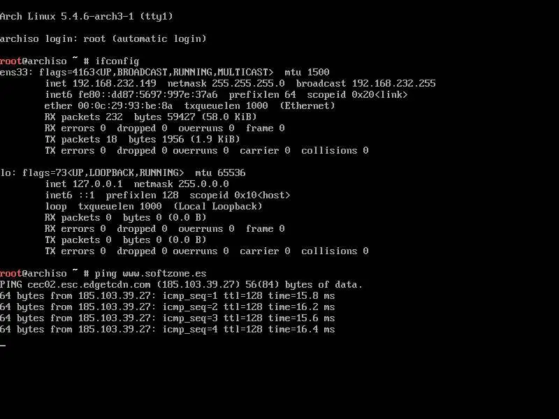 Après quelques secondes, nous pouvons voir un terminal racine. Avec la commande «ifconfig» nous pouvons vérifier qu’en effet, une IP a été assignée à notre Arch, et avec la commande «ping» nous vérifierons que nous avons une connexion Internet.