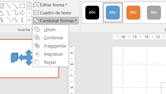 En fait, c’est une liste déroulante où nous observons plusieurs options dans lesquelles les objets que nous avions précédemment marqués peuvent être combinés pour créer le nouveau. En fait, l’un des grands avantages que nous avons ici est que, comme nous nous positionnons sur l’une de ces alternatives, les changements seront visibles sur la diapositive en temps réel afin que nous puissions choisir celle qui nous intéresse le plus.
