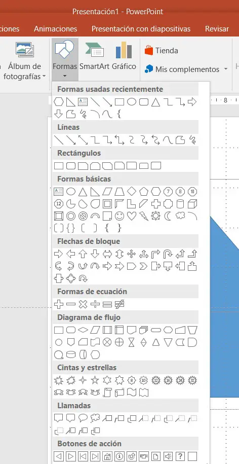 Ensuite, une liste déroulante apparaîtra où nous pouvons trouver la grande variété de ces éléments que le programme nous présente. Eh bien, nous devons simplement en ajouter deux à une diapositive de la présentation afin de pouvoir les fusionner. Une fois que nous les avons ajoutés à la conception de diapositive correspondante, nous devons marquer les deux simultanément. C’est quelque chose que nous réalisons en cliquant sur les deux avec la souris , mais en maintenant la touche Ctrl du clavier enfoncée.