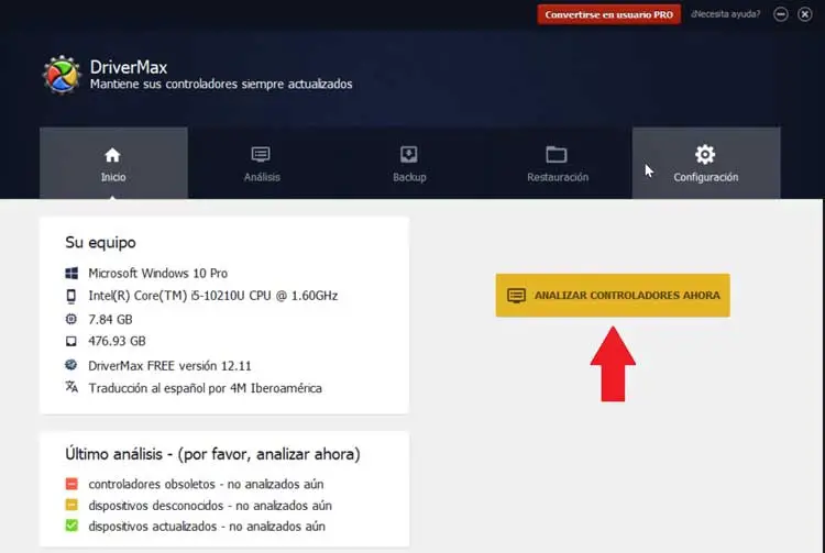 La première chose que nous allons faire est de dire au programme d’ analyser tous nos pilotes , pour lequel nous cliquons sur le bouton «Analyser les pilotes maintenant». Ensuite, nous voyons un peu de publicité nous invitant à passer à la version PRO avec une offre. Nous le sautons en cliquant sur «Non merci, retour à DriverMax GRATUIT».