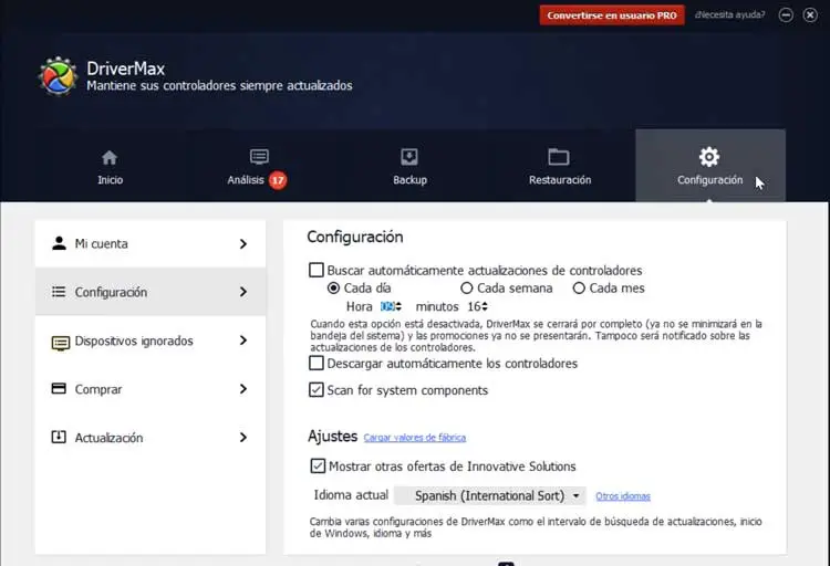 Dans la section «Paramètres», nous pouvons définir certains paramètres du programme, tels que la recherche automatique de la mise à jour du pilote . Nous pouvons choisir que cela soit fait tous les jours, toutes les semaines ou tous les mois, ainsi que l’heure souhaitée. Une fois la recherche terminée, nous recevrons des notifications contextuelles à chaque fois qu’il y aura des résultats puisque le programme restera actif dans la barre d’état système. Nous pouvons également choisir de prendre en charge le téléchargement automatique de tous les pilotes à chaque fois qu’il en trouve un nouveau lors de la recherche.