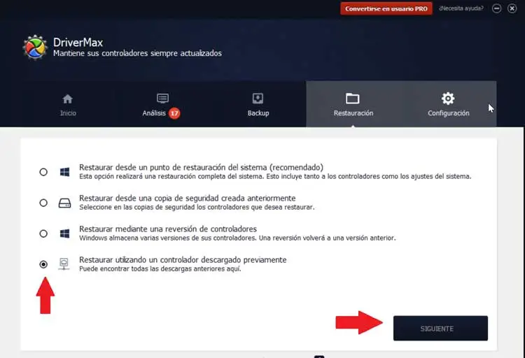 Comme nous avons précédemment téléchargé un pilote, nous sélectionnons cette dernière option et cliquons sur suivant. Le dernier pilote téléchargé apparaît, ainsi que sa version et sa date de téléchargement. En le sélectionnant, nous pouvons à la fois l’effacer et le restaurer en cliquant sur Restauration.