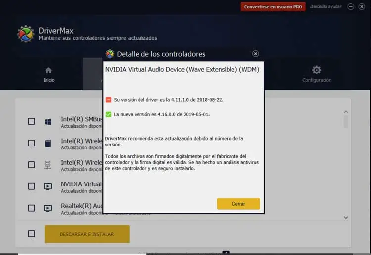 Nous retournons à l’interface du programme, et nous voyons comment le programme nous place automatiquement dans l’onglet «Analyse». Ici, il nous montrera dans un cercle rouge le nombre total de mises à jour qu’il a trouvées. Dans le menu, nous verrons en panne, chacun des contrôleurs trouvés, que nous pouvons sélectionner ceux que nous souhaitons mettre à jour. Si nous positionnons le pointeur de la souris sur chacun d’eux, sur le côté gauche à côté du bouton «Mettre à jour», nous verrons une icône en forme de note. Si nous appuyons dessus, toutes les informations sur notre version du contrôleur et la nouvelle version trouvée apparaissent. Il nous informe également que le pilote a été signé numériquement par le fabricant et que son téléchargement est totalement sécurisé.