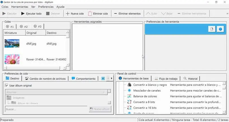 Dans la barre d’outils de la barre supérieure, vous avez également le Batch Queue Manager . A partir de cette option, nous pourrons effectuer toutes sortes de réglages et d’édition des images par lot, c’est-à-dire effectuer toutes les opérations en même temps sur toutes les images sélectionnées. En bas à gauche, nous aurons un panneau de configuration. De là, nous pouvons sélectionner divers outils d’édition à configurer à notre guise afin qu’ils soient appliqués de manière égale à toutes les images que nous avons sélectionnées. Nous aurons des outils tels que la correction BCG, la conversion en noir et blanc, le mélangeur de canaux, la balance des couleurs, parmi de nombreuses autres options. Plus notre capacité à l’utiliser est grande, meilleurs et plus rapides seront les résultats.