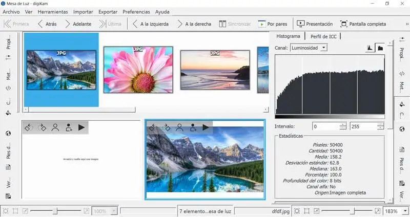 Grâce à l’option Table of Light , une nouvelle fenêtre apparaîtra, avec différentes options d’outils dans les colonnes de gauche et de droite. Nous pouvons vérifier les propriétés de l’image, définir les métadonnées, modifier l’ histogramme et le profil ICC . Il a également l’option Légendes des photos, où nous pouvons ajouter une description, des étiquettes et des informations de la photo, afin que nous puissions l’organiser et la classer de la bonne manière. De là, nous pouvons passer en revue chacune des photos dans le dossier sélectionné, étant possible de les afficher en plein écran ou à travers une présentation sous forme de diapositives.