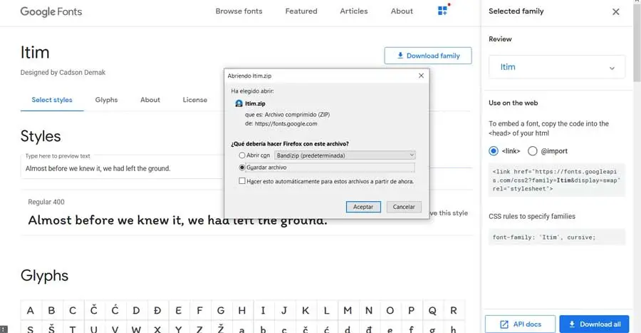 Quoi qu’il en soit, une fois que nous avons trouvé la police que nous voulons utiliser dans le programme, nous n’avons plus qu’à télécharger le package de polices correspondant sur le PC. À ce stade, nous vous dirons que tous sont en règle générale regroupés dans un fichier compressé au format ZIP que nous pourrons extraire plus tard. Par conséquent, une fois que nous avons téléchargé la police en tant que telle, nous enregistrons le fichier ZIP sur l’ordinateur, à l’emplacement que nous choisissons.