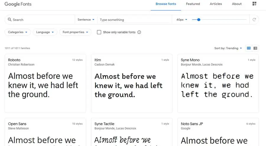 Mais bien sûr, pour utiliser de nouvelles polices dans ce programme de retouche, la première chose dont nous avons besoin est de les mettre la main sur. C’est quelque chose que nous pouvons faire gratuitement, ainsi que payer pour des publicités. À ce stade, vous devez savoir que sur Internet, vous pouvez trouver une multitude de portails Web qui vous fournissent ce type d’éléments typographiques. Comme nous l’avons mentionné, vous trouverez des sources gratuites et payantes. Par exemple, nous pouvons utiliser l’un des sites les plus populaires, principalement en raison de l’entreprise à laquelle il appartient. Nous faisons référence aux polices Google populaires auxquelles nous pouvons accéder à partir de ce lien .
