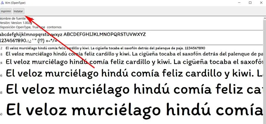 Une fois le fichier ZIP enregistré, nous l’ouvrons pour extraire la source téléchargée en tant que telle, qui entre. TTF . Eh bien, une fois que nous avons cet autre fichier en vue, nous cliquons deux fois dessus, par exemple à partir de l’explorateur de fichiers Windows. C’est alors que nous sommes prêts à ajouter ce nouvel élément que nous venons de télécharger, dans le système, en l’occurrence la source appelée Itim. Ainsi, en double-cliquant sur le TTF, dans ce cas, la fenêtre OpenType s’ouvre , il ne nous restera donc plus qu’à cliquer sur le bouton Installer.