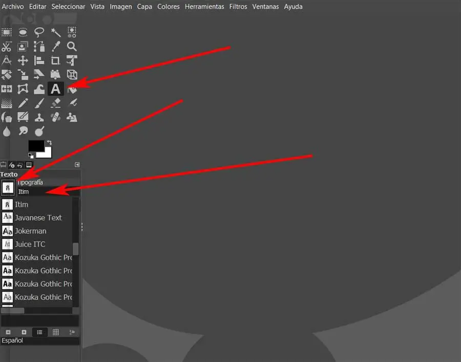 Ce sera alors lorsque nous pourrons utiliser la police que nous venons de télécharger et d’installer dans le système, dans le programme de retouche photo. Pour ce faire, il suffit de se rendre dans la section intitulée Texte du programme. Pour que cela apparaisse, la meilleure chose est que nous cliquons d’abord sur l’outil qui est représenté par un T dans la barre GIMP. Celui-ci est situé sur le côté gauche de l’ interface principale du programme .