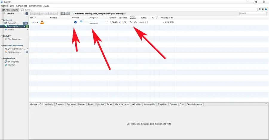 À ce stade, nous vous dirons que dans la partie gauche de la fenêtre principale du programme, nous avons accès à ses sections. Ainsi, nous pouvons voir à l’écran les collections que nous téléchargeons, les téléchargements individuels, les notifications ou les nouveautés chez BiglyBT. Il est également frappant de constater la grande quantité d’informations que nous trouvons au premier coup d’œil lorsque nous chargeons un torrent. De cette façon, nous verrons la vitesse de téléchargement actuelle en temps réel, sa progression, sa taille d’ origine, le temps restant estimé , etc.