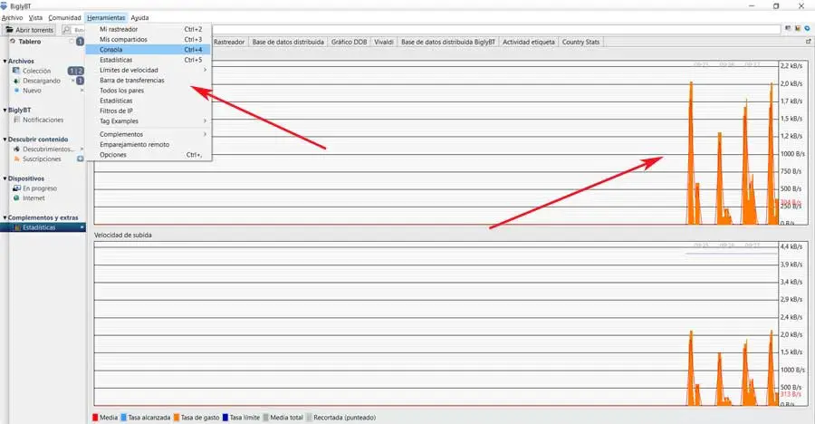 Il nous offre également un bon nombre de fonctions supplémentaires avec lesquelles il est destiné à améliorer l’utilisation du programme. Une bonne partie d’entre eux se trouve dans le menu Outils de son interface principale. Par exemple, à partir d’ici, nous pouvons voir le torrent que nous avons partagé avec d’autres à ce moment-là, les statistiques d’ utilisation à travers des graphiques.