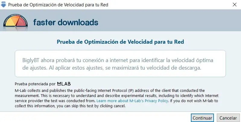 C’est quand il s’agit d’installer le programme sur le PC, car ses particularités ne s’arrêtent pas là, du moins quand il s’agit de le démarrer. Il est également intéressant de noter que la première fois que nous l’exécutons, il propose de faire un test de connexion. De cette manière, BiglyBT mesure le type de connexion dont nous disposons pour améliorer et optimiser son fonctionnement.