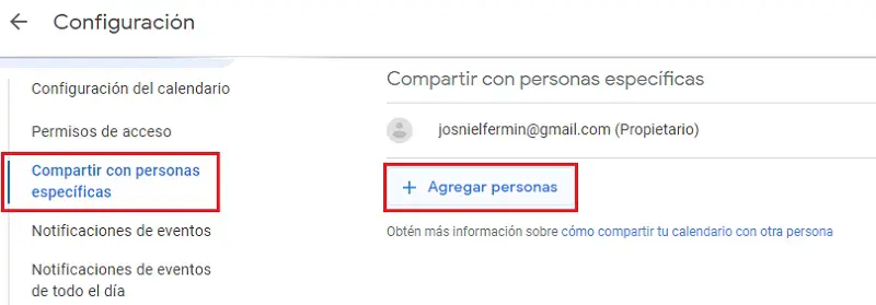 Pour ajouter les autres personnes au calendrier, nous retournons dans les «Paramètres» de celui-ci et entrons «Partager avec des personnes spécifiques».