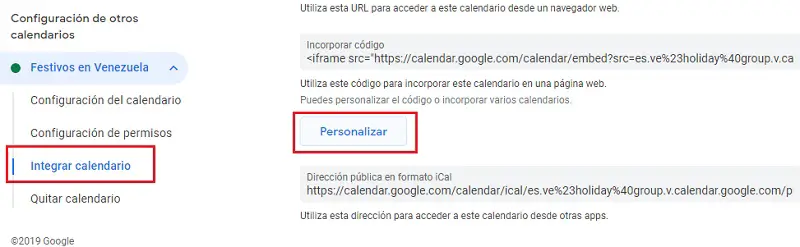 Depuis la «Configuration des autres calendriers» nous allons cliquer sur «Intégrer le calendrier» puis sur «Personnaliser».