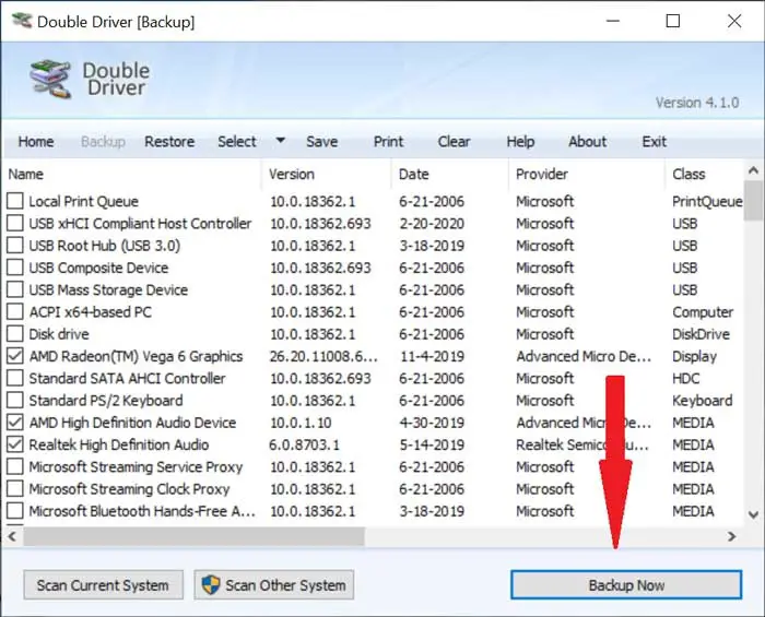 Una vez haya realizado el escaneo, que es cuestión de segundos, nos aparecerá una lista con todos los controladores de nuestro equipo y toda la información que sobre ellos hay disponible, como la versión, la fecha o el proveedor entre otros. Ahora sólo debemos seleccionar todos aquellos de los que queramos hacer nuestro backup y pulsar en “Backup Now”.