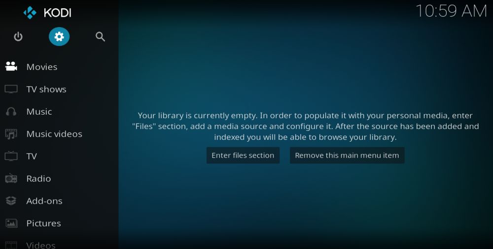 - Ouvrez Kodi et cliquez sur l’ icône Paramètres , qui ressemble à une roue dentée, et se trouve en haut à gauche de l’écran.