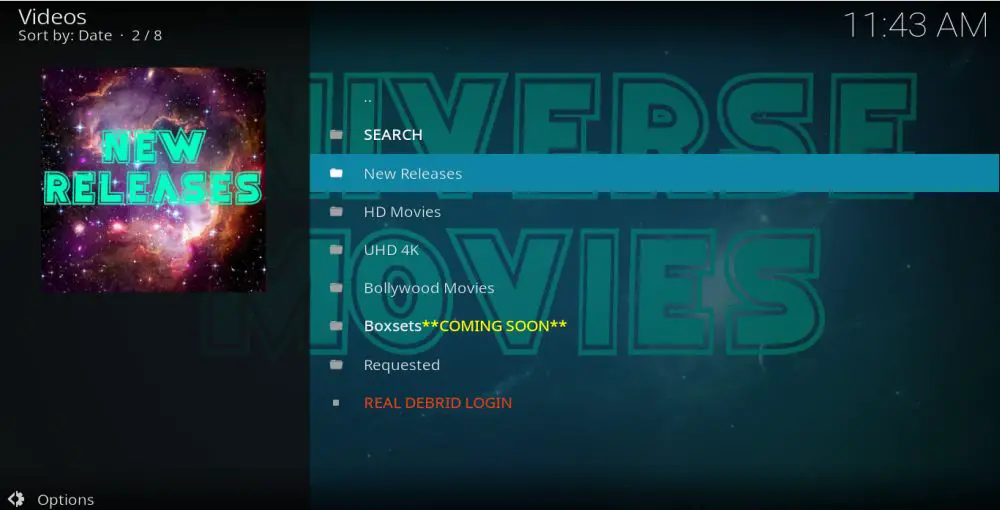 Lorsque vous ouvrez pour la première fois l’addon Universe HD Kodi, vous verrez une fenêtre contextuelle vous informant que cet addon continuera à ajouter des films pendant des semaines et des mois à venir. Il vous suffit de cliquer dessus pour obtenir le bon plugin, mais cela vous indique que le développeur s’efforce de rendre ce plugin le meilleur possible et de constamment mettre à jour le contenu disponible. Une fois que vous arrivez au menu principal, vous serez présenté avec un menu simple et concis construit dans un design de science-fiction élégant.Certains plugins de films peuvent rendre les choses trop compliquées et encombrées dans le menu principal dans le but d’inclure autant de fonctionnalités différentes que possible, il est donc assez rafraîchissant de trouver un développeur heureux de garder les choses simples. Regarder le menu principal vous donne une idée du contenu que vous trouverez dans le plugin Universe HD. Il comprend: