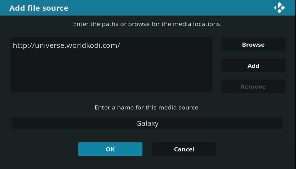 - Dans la boîte de dialogue intitulée Ajouter une source de fichier , cliquez à l’endroit où il est dit <Aucun> , puis entrez exactement l’URL suivante: https://universe.worldkodi.com. Cliquez sur OK et vous devrez donner à cette nouvelle police un nom, tel que Galaxy, avant de cliquer sur OK
