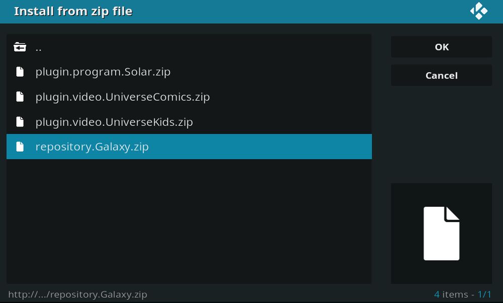 - Cliquez sur Installer à partir du fichier zip , puis sélectionnez Galaxy et cliquez sur un fichier appelé galaxy.xxzip. Cliquez sur OK et cela installera le référentiel Galaxy sur Kodi. Cela peut prendre quelques minutes, alors soyez patient. Il y aura une notification en haut à droite de l’écran lorsque vous avez terminé.