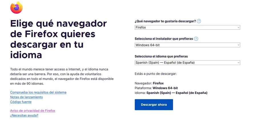 D’autre part, si nécessaire, nous avons également la possibilité de télécharger le programme depuis le site officiel de l’entreprise, un processus que nous pouvons effectuer à partir de ce lien . Cependant, nous devons garder à l’esprit que pour l’installer plus tard, nous aurons besoin d’une connexion Internet active. Nous vous disons cela car lors du téléchargement de Firefox à partir du lien que nous venons de mentionner, nous ne téléchargeons pas réellement le programme en tant que tel.