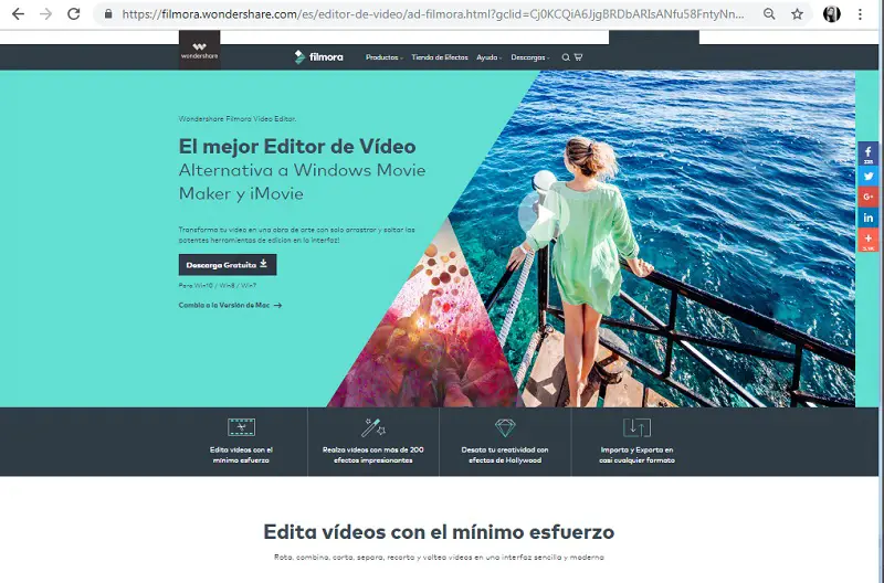 Peu importe l’appareil par lequel vous entrez dans la page, cela fonctionne de toute façon pour vous. Ce site Web est une option très intéressante car si vous aimez travailler à partir de votre cloud et n’avez pas à télécharger de programme, vous pouvez le faire sans aucun problème. Il dispose d’une grande variété d’outils pour que vous puissiez faire une combinaison de vos audiovisuels avec une excellente qualité et ainsi appliquer des effets, couper, coller, ajouter des titres, des filtres et d’autres choses. La seule chose est que vous devez vous inscrire et cela ne vous donne un service gratuit que pendant 15 jours.