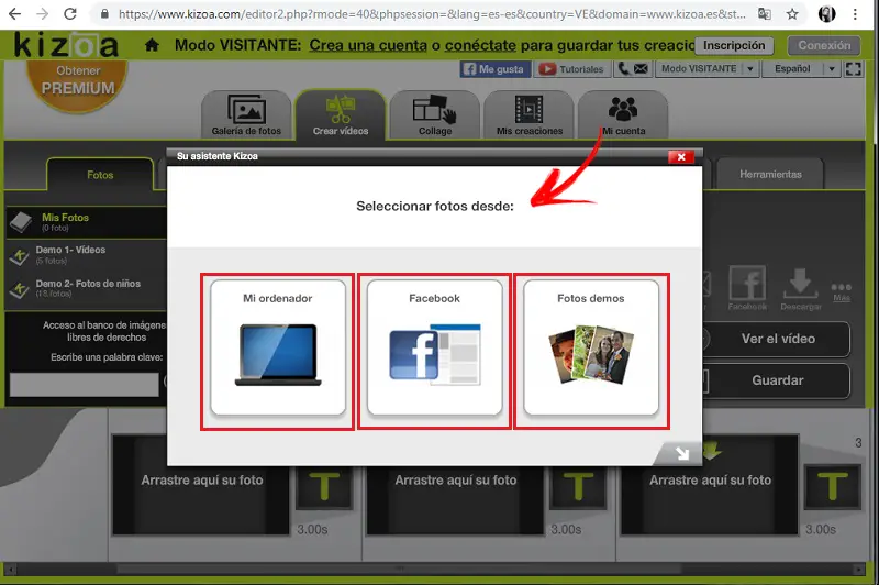 - Lors du téléchargement, vous pouvez choisir d’où vous allez l’importer, que ce soit depuis votre ordinateur ou un réseau social. C’est une très bonne option puisque vous pouvez utiliser vos photos et vos clips Facebook pour faire votre montage vidéo, ou si vous préférez les télécharger à partir d’un dossier précédemment sélectionné sur votre ordinateur.