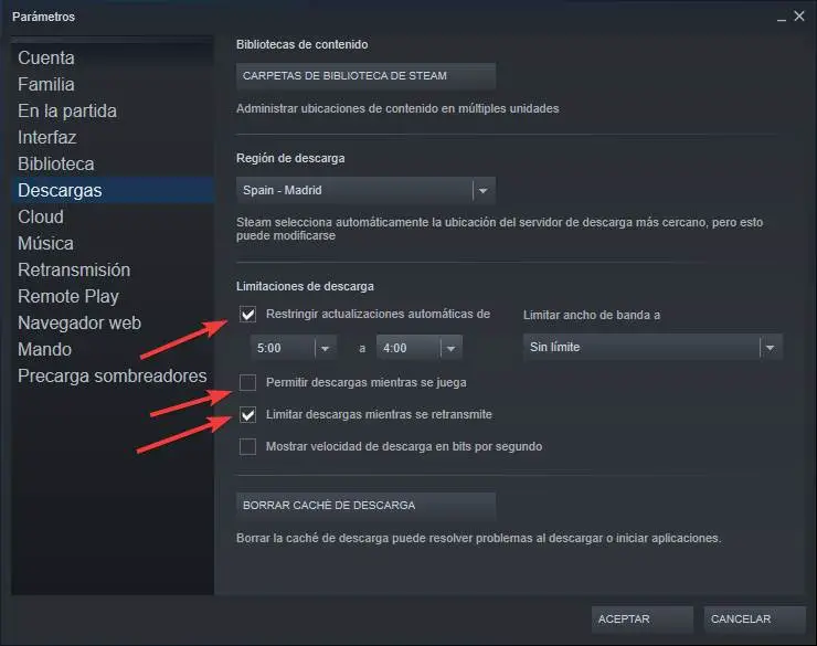 Le premier qui nous intéresse est » restreindre les mises à jour automatiques «. Bien que Steam n’ait pas la possibilité de bloquer toujours les mises à jour automatiques, nous pouvons utiliser cette option pour limiter les heures. Si nous choisissons deux heures d’affilée, la nuit, à moins que l’ordinateur soit allumé et que ce client soit ouvert, nous empêcherons le téléchargement automatique des mises à jour.