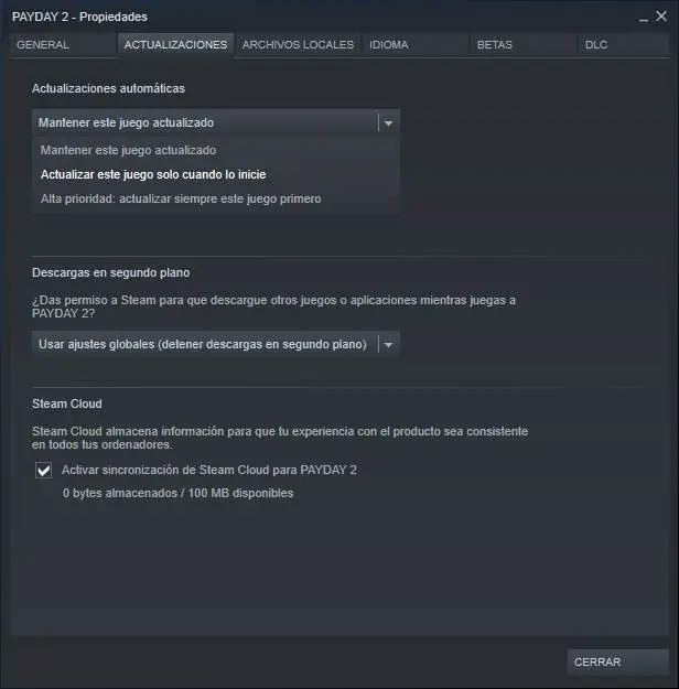 Pour ce faire, nous allons faire un clic droit dessus, ouvrir la fenêtre des propriétés du jeu, et, dans l’onglet «mises à jour», nous choisirons que nous voulons mettre à jour le jeu uniquement lorsqu’il démarre.
