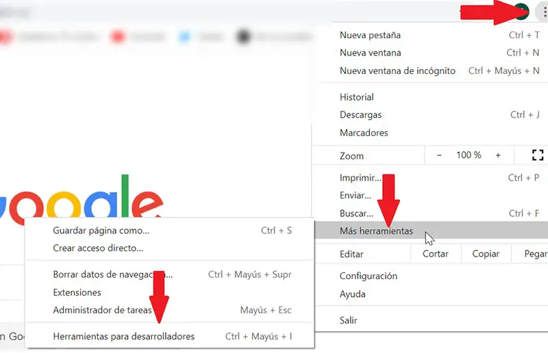De cette façon, nous devrons ouvrir le navigateur Google et cliquer sur les trois points dans la partie supérieure droite pour qu’un menu déroulant apparaisse. Ici, nous devons aller à la section «Plus d’outils» et enfin aux «Outils de développement». On peut aussi y accéder directement en utilisant le raccourci clavier «Ctrl + Shift + I».