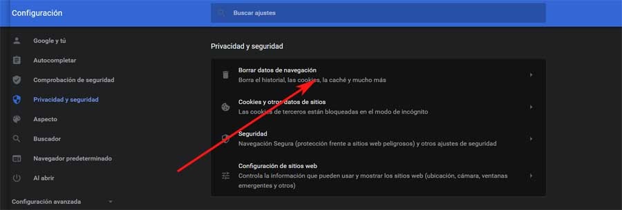 C’est une décision que nous devons également prendre en compte, car un cache obsolète peut empêcher la fonction de saisie semi – automatique de fonctionner. C’est pourquoi la meilleure décision que nous puissions prendre à cet égard est de la supprimer du programme lui-même. Eh bien, pour atteindre cet objectif que nous commentons, nous retournons à la section Configuration du logiciel et allons à Confidentialité et sécurité / Effacer les données de navigation.