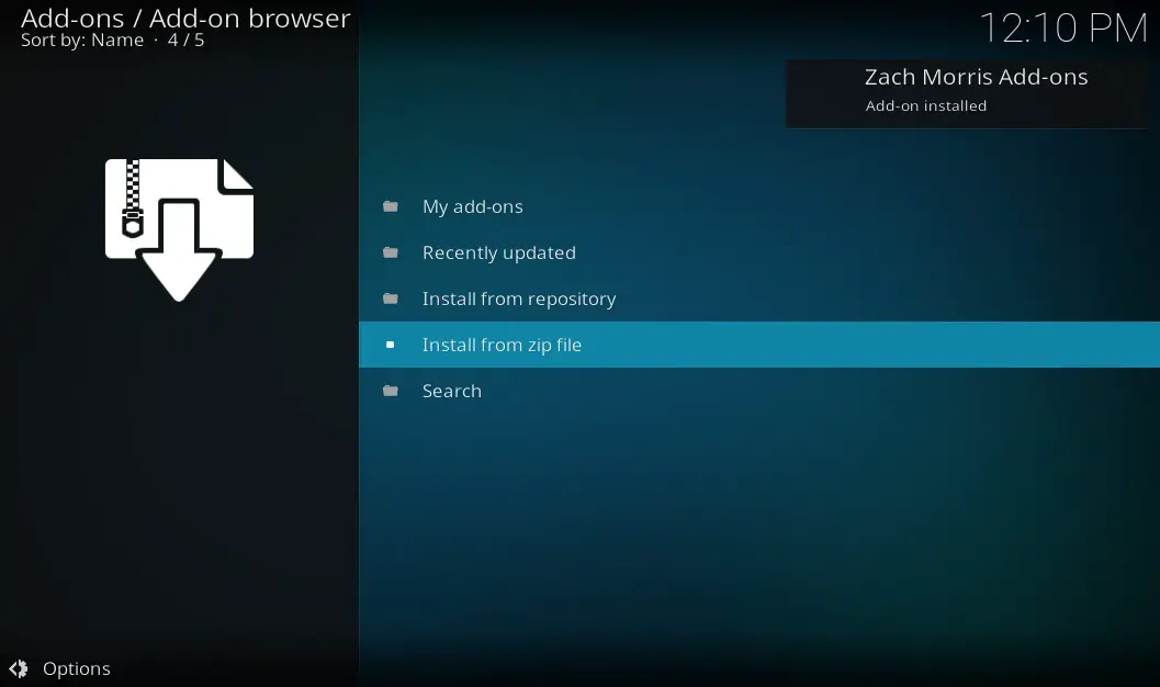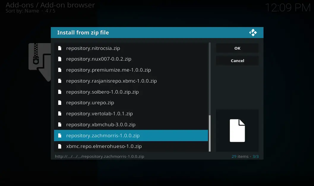 12. Cliquez sur fusion , puis kodi-repos , puis anglais , puis repository.zachmorris-1.0.0.zip