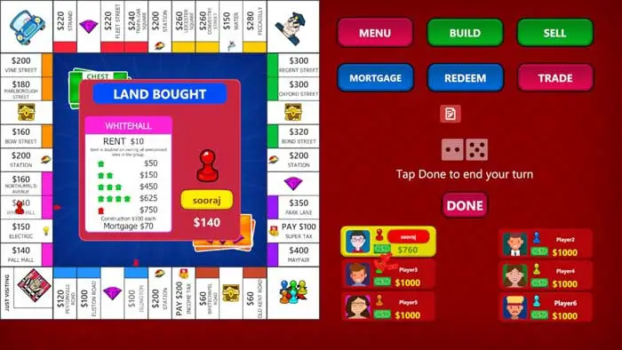 C’est un jeu pour 2 à 6 joueurs qui nous rappellera la table classique Monopoly . L’objectif du jeu est assez simple et ce n’est autre que de gagner tout l’argent que vous pouvez pour mettre vos adversaires en faillite. Lancez les dés, payez un loyer, achetez une propriété, gagnez des enchères, créez une maison et des hôtels, échangez vos propriétés et dirigez le monde comme si vous étiez un véritable magnat des affaires. Jouez contre l’ordinateur, avec vos amis en multijoueur local ou avec des millions de joueurs du monde entier en multijoueur en ligne. Vous pouvez également créer des salles privées et inviter vos amis à voir comment vous développez votre entreprise et dirigez le monde avec sagesse.