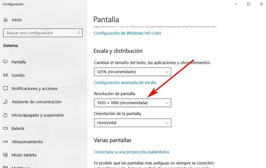 En changeant le troisième, pour cet échec également connu sous le nom de bégaiement, nous vous recommandons d’ajuster la résolution d’écran définie dans Windows 10. Nous vous le disons, car l’utilisation d’une résolution supérieure ou inférieure à celle recommandée peut se traduire par ces scintillements lors de la lecture de vidéos. Pour ce faire, cliquez avec le bouton droit sur le bureau et sélectionnez Paramètres de l’écran. Cela nous mènera à l’application de configuration Windows 10 , où nous pouvons désormais ajuster la résolution à laquelle nous nous référons.