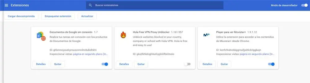 Mais de la même manière, le bégaiement peut être donné par le navigateur lui-même, en particulier par les extensions largement utilisées que nous installons dans Chrome . Certaines de ces extensions peuvent provoquer une incompatibilité qui affecte la lecture des vidéos. Donc, à ce stade, nous vous recommandons de tous les désactiver et de les activer un par un pour tester celui qui pose problème . C’est quelque chose que nous réalisons à partir de la section qui apparaît dans le menu Plus d’outils / Extensions. Ainsi, il est plus que probable que ce problème avec le saut ou le scintillement des vidéos dans Chrome, soit demandé.