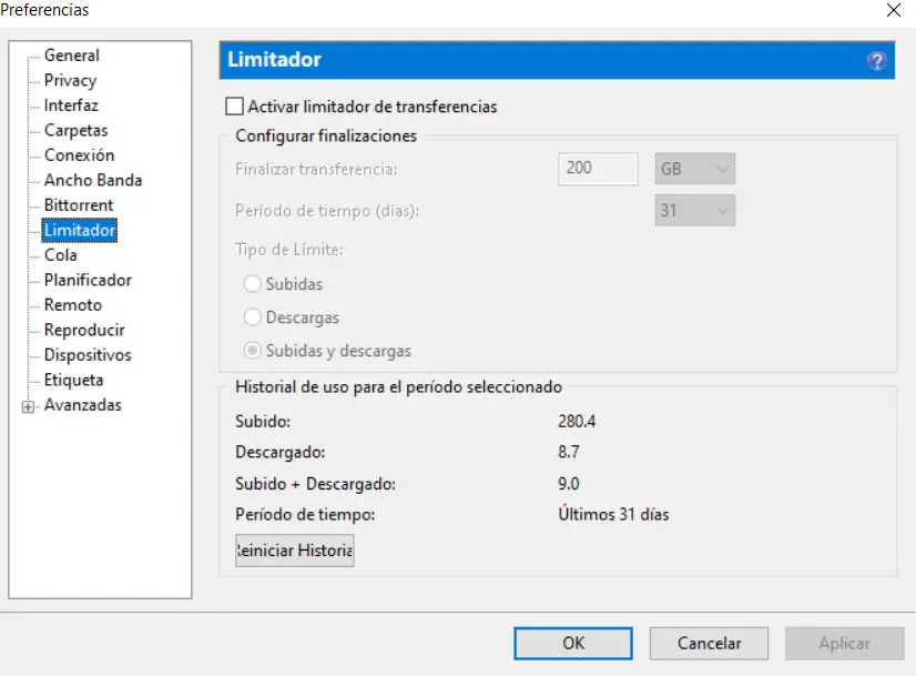 Eh bien, dans le cas qui nous concerne, l’option qui nous intéresse est celle du «Limiter», comme son propre nom nous permet de le voir. Ainsi, nous cliquons dessus pour voir les options dont nous disposons pour limiter l’ utilisation des données dans uTorrent. La première chose que nous faisons ici est d’activer le «Transfer Limiter», qui par défaut est désactivé. Ce sera alors quand nous pourrons établir les limites que nous voulons.