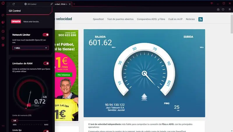 En activant chacune des options, nous pouvons limiter les ressources que ce navigateur peut utiliser. Par exemple, mettons-le à l’épreuve en limitant la vitesse Internet à 1 Mo / s et l’utilisation de la RAM à 1 Go au maximum . Nous activons les cases correspondantes, ajustons les valeurs et c’est tout. Le nouvel Opera GX devrait désormais respecter nos limites. Il est évident que selon la connexion que nous avons et le PC, ces valeurs varient pour chaque utilisateur ou moment.