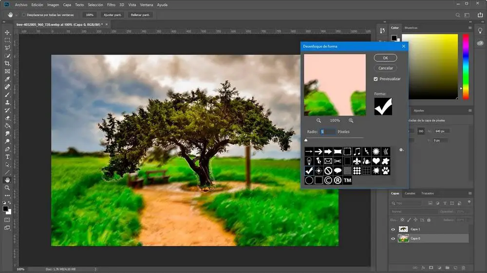 C’est un autre des effets que nous allons trouver pour appliquer cet effet à nos photos. Comme son nom l’indique, il permet d’appliquer un type de flou suivant une série de formes, ou motifs. Ces motifs peuvent être sélectionnés lors de la sélection de l’effet, ainsi que le rayon de l’effet à partir d’eux.