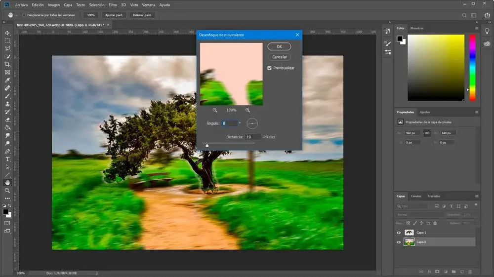 Cet effet Photoshop nous permet d’appliquer un flou à la photo comme si nous l’avions fait en mouvement et avec un temps de pose très long. En sélectionnant l’effet, nous pouvons configurer le degré de mouvement, ainsi que son angle.