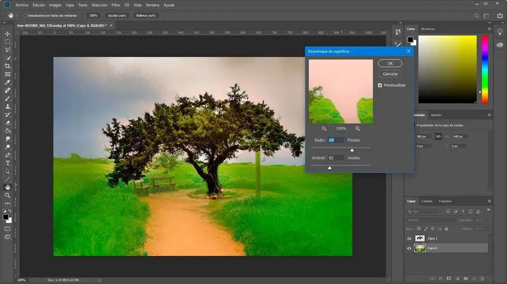 Très utile pour le lissage. Cet effet de flou est assez différent des précédents, et c’est que, comme on peut le voir, il se concentre sur l’application d’un effet similaire à celui du reste de la surface de la photo pour adoucir à la fois les bords et les éléments de celle-ci. Nous pouvons également l’utiliser pour appliquer de la brume ou d’autres éléments aux photos. Un effet assez difficile à maîtriser.