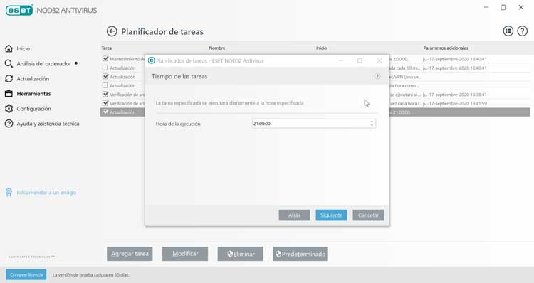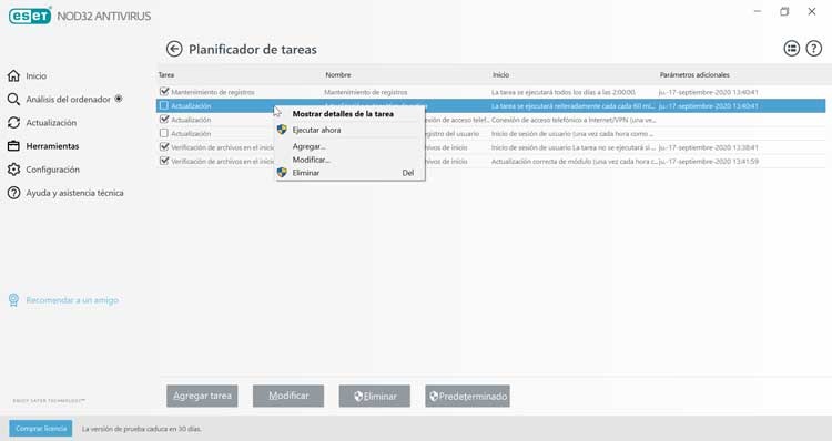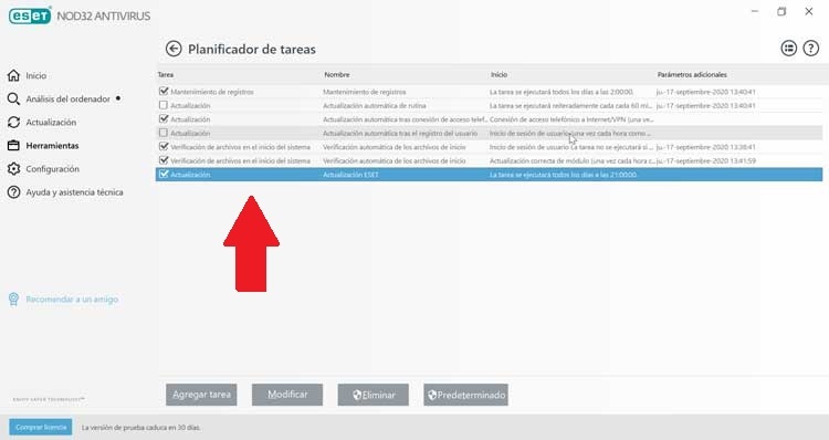 Por ello si queremos crear una tarea de actualización, debemos de pulsar en el apartado de «Herramientas» que encontraremos en la barra de tareas dentro del menú principal de nuestro antivirus ESET. Una vez pulsado, nos aparecerá otra pantalla donde debemos de pulsar sobre la función de «Planificador de tareas».