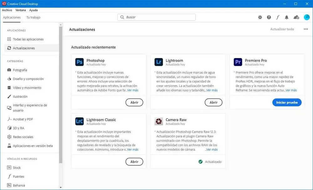 Garder nos programmes toujours à jour est très important si nous voulons éviter des problèmes dans notre quotidien. Certains programmes (tels que les navigateurs) se mettent à jour automatiquement pendant que nous les utilisons afin que nous ayons toujours la dernière version. D’autres programmes nous montrent un avertissement et nous obligent à aller sur le site officiel pour télécharger les nouvelles versions et les installer. Et d’autres, comme Photoshop et d’autres programmes Adobe, ont un programme chargé de contrôler tous les logiciels (Adobe Creative Cloud Desktop) à partir duquel nous pouvons télécharger très facilement les nouvelles versions et toutes les mises à jour pour maintenir nos logiciels à jour.