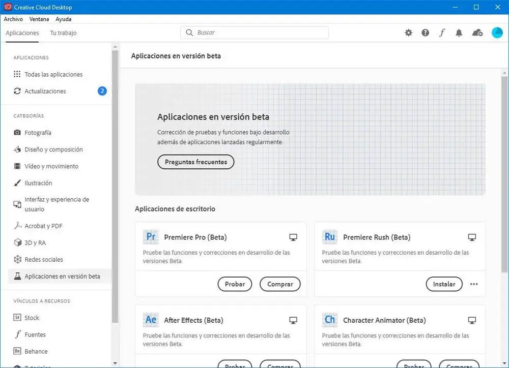 Si notre abonnement Adobe inclut ces programmes, nous pouvons les installer directement. Si nous n’avons pas ces abonnements, nous pouvons télécharger les versions d’essai de ces versions bêta que nous pouvons utiliser gratuitement pendant quelques jours.