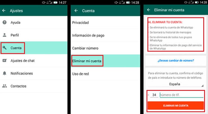 - Une fois sur place, allez à la dernière option, descendez et cliquez sur «Supprimer le compte». * Vous devez savoir que ce processus vous supprimera de tous les groupes, de l’historique des conversations, etc.