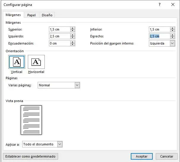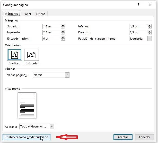 Pour ce faire, nous resterons dans la fenêtre précédente, dans laquelle une option apparaît pour corriger ces données de façon permanente. Tous les documents Word que nous créons seront établis avec cette nouvelle configuration de marge, mais pour cela nous devrons la choisir au préalable.