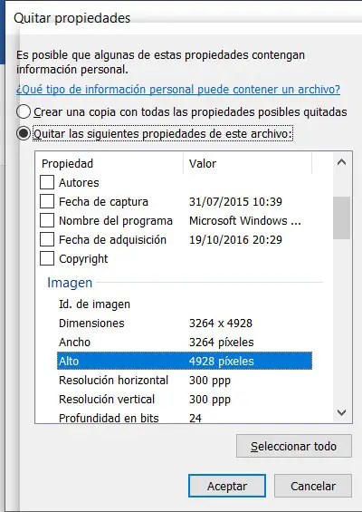 Dans la nouvelle fenêtre qui apparaît, nous allons dans l’ onglet détails, où nous pouvons voir de première main toutes les métadonnées correspondant à cette photo. Eh bien, au bas de cette même section, nous trouvons un lien qui lit «Supprimer les propriétés et les informations personnelles», où nous cliquons. Cela nous amènera à une nouvelle fenêtre dans laquelle nous pouvons cocher l’option «Supprimer les propriétés suivantes de ce fichier». Ensuite, nous n’aurons plus qu’à marquer les métadonnées que nous voulons éliminer, de la liste qui apparaît ci-dessous.