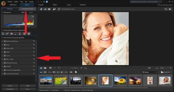Dans la section Réglage , nous aurons des outils pour modifier la balance des blancs, la tonalité, le niveau, la courbe, ajouter un effet HDR, la correction de l’objectif ou la division des tons. À partir de cette option, il sera également possible d’éliminer les taches ou d’éliminer les yeux rouges gênants. Tous peuvent être utilisés en définissant leurs valeurs et en observant leurs résultats clairement et directement sur la photo, jusqu’à trouver l’édition parfaite de l’image.
