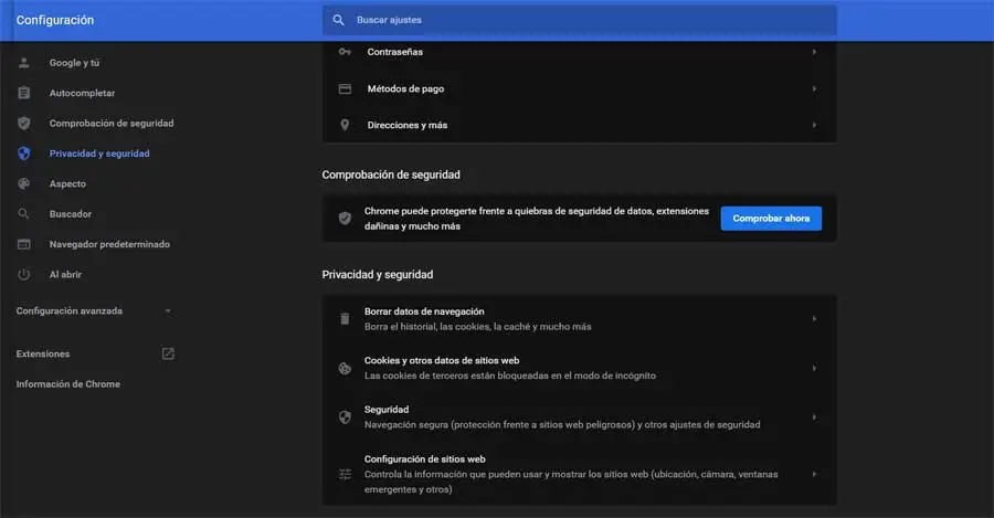 De plus, leurs développeurs, conscients de l’importance de tout ce qui concerne la confidentialité et la sécurité , s’efforcent d’améliorer cela. Ainsi, ils intègrent des fonctions associées nouvelles et renouvelées dans les dernières versions de leurs projets. C’est quelque chose que l’on retrouve, par exemple, dans le logiciel de ce type le plus utilisé dans le monde, Google Chrome. Une bonne partie de ces fonctions peut être vue et configurée à partir de l’option Confidentialité et sécurité du navigateur lui-même.