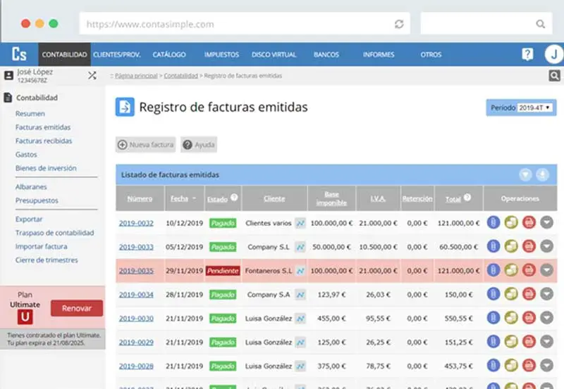 Contasimple est un programme comptable développé dans un environnement Web pour faciliter la facturation, la comptabilité et toutes sortes de calculs fiscaux. Avec cet outil, nous pouvons obtenir de manière simple, confortable et proche la gestion de notre entreprise, convenant aux entreprises, PME ou agences. Avec Contasimple nous pouvons tenir les livres officiels et nous fournir des informations sur l’état des factures (encaissées, impayées, retours). De plus, nous aurons instantanément le calcul de la TVA, de l’impôt sur le revenu des personnes physiques, de la retenue à la source et des opérations avec des tiers. Cela nous permettra également de créer des graphiques visuels sur l’état de notre entreprise en temps réel.
